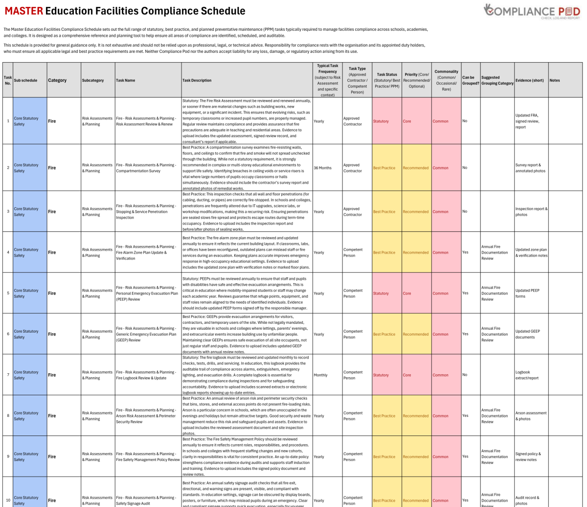 Developed in collaboration with schools, colleges, and Trusts, the Framework provides a single, authoritative structure for managing every statutory, best-practice, and preventative maintenance task required to operate a safe and compliant education estate.